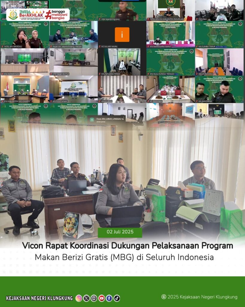 Pada hari Selasa, 02 Juli 2025, bertempat di Ruang Kerja Bidang Intelijen Kejaksaan Negeri Klungkung, Kepala Seksi Intelijen Ngurah Gede Bagus Jatikusuma, S.H., bersama para CPNS Jaksa dan Staf Bidang Intelijen, turut serta dalam Vicon Rapat Koordinasi Dukungan Pelaksanaan Program Makan Bergizi Gratis (MBG) di Seluruh Indonesia.