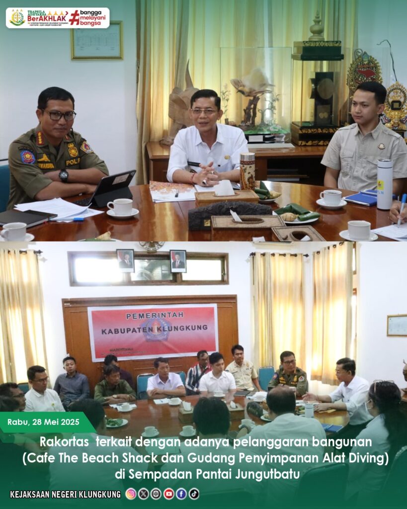 Rapat dipimpin langsung oleh Bupati Klungkung dan turut dihadiri Kasatpol PP serta unsur Forkopimda lainnya. Agenda utama membahas pelanggaran bangunan yang diduga melanggar garis sempadan pantai, yakni Cafe The Beach Shack dan Gudang Penyimpanan Alat Diving di Pantai Jungutbatu.