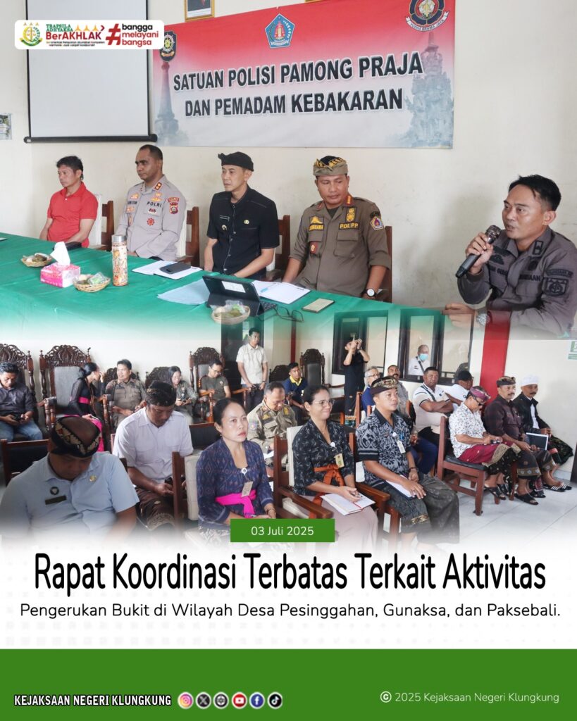 Kepala Kejaksaan Negeri Klungkung, Dr. L.B Hamka, S.H., M.H., yang diwakili oleh Kepala Seksi Intelijen, Ngurah Gede Bagus Jatikusuma, S.H., menghadiri rapat koordinasi terbatas terkait aktivitas pengerukan bukit di wilayah Desa Pesinggahan, Gunaksa, dan Paksebali.