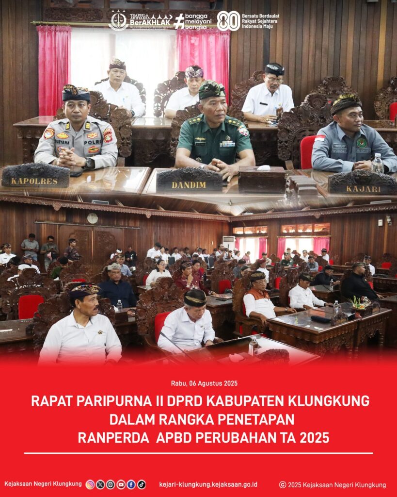 Kepala Seksi Intelijen Kejaksaan Negeri Klungkung, Ngurah Gede Bagus Jatikusuma, S.H., turut hadir dalam Rapat Paripurna II DPRD Kabupaten Klungkung dalam rangka penetapan Ranperda APBD Perubahan TA 2025 Rabu (6/8/2025).
