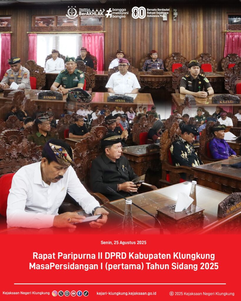 Kejaksaan Negeri Klungkung melalui Kasubsi II Intelijen, Chicko Surya Siswanto, S.H., menghadiri Rapat Paripurna II DPRD Kabupaten Klungkung pada Senin, 25 Agustus 2025. Kehadiran ini dalam rangka mewakili Kejaksaan Negeri Klungkung dalam pembahasan dan penetapan tiga Ranperda penting, yaitu: pencabutan Perda tentang Bea Leges, pencabutan Perda tentang Biaya Surat Kenal Lahir & Kenal Mati, serta pencabutan Perda tentang Susunan Organisasi dan Tata Kerja Pemerintah Desa beserta Perangkat Desa. Langkah ini menjadi bagian dari upaya mendukung penyelarasan regulasi agar lebih relevan dan bermanfaat bagi masyarakat.