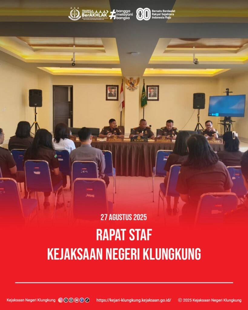 Dalam rapat staf yang dipimpin Kajari Klungkung, I Wayan Suardi, S.H., M.H., dibahas langkah strategis untuk meningkatkan kualitas SDM dan etos kerja, sekaligus persiapan kegiatan Hari Lahir Kejaksaan.