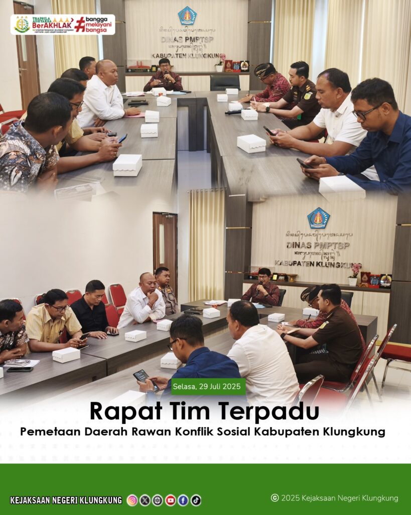 Klungkung, Selasa, 29 Juli 2025 – Kejaksaan Negeri Klungkung yang diwakili oleh Kasubsi II Seksi Intelijen, Chicko Surya Siswanto, S.H., menghadiri Rapat Tim Terpadu Pemetaan Daerah Rawan Konflik Sosial Kabupaten Klungkung. Kegiatan tersebut berlangsung di Ruang Rapat Mall Pelayanan Publik Kabupaten Klungkung.