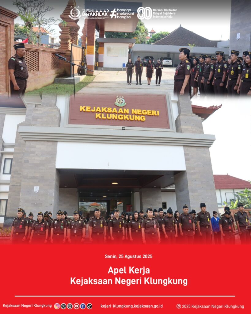Senin, 25 Agustus 2025 bertempat di Kejaksaan Negeri Klungkung seluruh Pegawai dan PPNPN Kejaksaan Negeri Klungkung telah melaksanakan Apel Kerja yang diterima oleh Putu Iskadi kekeran, S.H.M.H., selaku Kepala Seksi Tindak Pidana Khusus Kejaksaan Negeri Klungkung