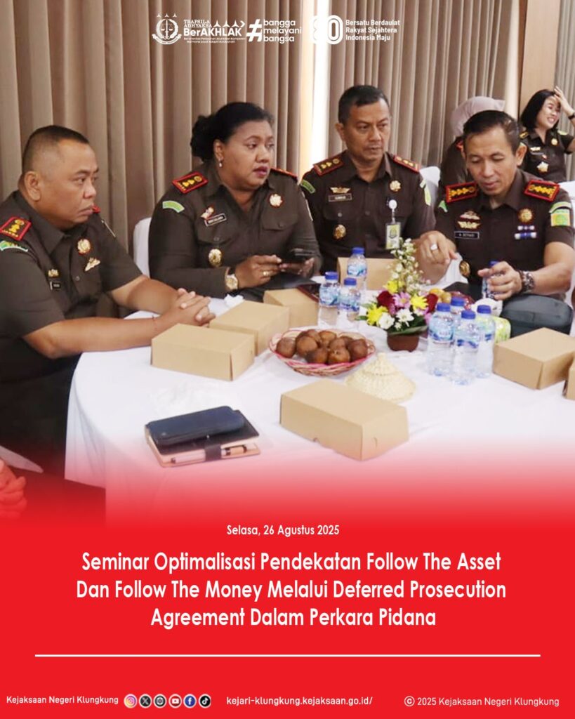 Dalam rangka memperingati Hari Lahir Kejaksaan ke-80, Kepala Kejaksaan Negeri Klungkung, I Wayan Suardi, S.H., M.H., didampingi para Kepala Seksi dan Jaksa Fungsional, menghadiri Seminar Optimalisasi Pendekatan Follow The Asset dan Follow The Money melalui Deferred Prosecution Agreement dalam Perkara Pidana, yang bertempat di Auditor St. Burhanuddin, Kejaksaan Tinggi Bali.