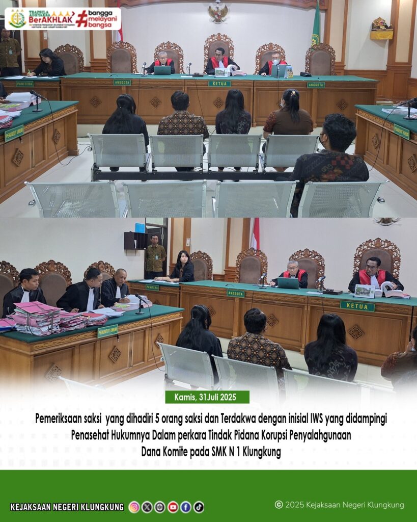 Pada Hari kamis Tanggal 31 Juli 2025 pukul 09.00 WITA, bertempat di ruang sidang Pengadilan Tindak Pidana Korupsi Pada Pengadilan Negeri Denpasar telah dilaksanakan Sidang Lanjutan dengan Agenda pembuktian pemeriksaan saksi yang dihadiri 5 orang saksi dan Terdakwa dengan inisial IWS yang didampingi Penasehat Hukumnya Dalam perkara Tindak Pidana Korupsi Penyalahgunaan Dana Komite pada SMK N 1 Klungkung