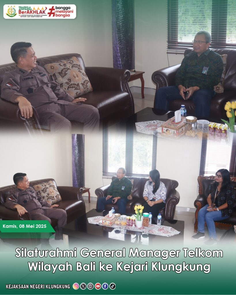Kepala Kejaksaan Negeri Klungkung, Dr. L.B Hamka, S.H., M.H., menerima kunjungan silaturahmi dari General Manager Telkom Wilayah Bali, dalam suasana yang penuh keakraban dan sinergi. Pertemuan ini menjadi ajang diskusi terkait penguatan komunikasi dan dukungan infrastruktur digital dalam mendukung pelayanan publik di lingkungan Kejari Klungkung.