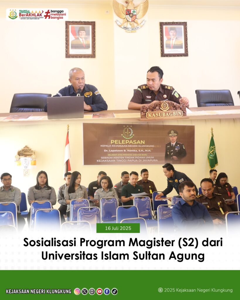 Dalam rangka peningkatan kapasitas dan kualitas SDM di lingkungan Kejaksaan Negeri Klungkung, telah dilaksanakan kegiatan Sosialisasi Program Magister (S2) dari Universitas Islam Sultan Agung (UNISSULA).