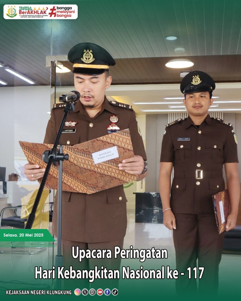 Selasa, 20 Mei 2025, bertempat di Lobby Kantor Kejaksaan Negeri Klungkung, Jalan Gajah Mada No. 56 Semarapura, seluruh Pegawai dan PPNPN Kejaksaan Negeri Klungkung mengikuti Upacara Peringatan Hari Kebangkitan Nasional ke 117 degan tema “Bangkit Bersama Wujudkan Indonesia Kuat” yang dipimpin oleh Kepala Sub Bagian Pembinaan Kejaksaan Negeri Klungkung, Julius Anthony, S.H.