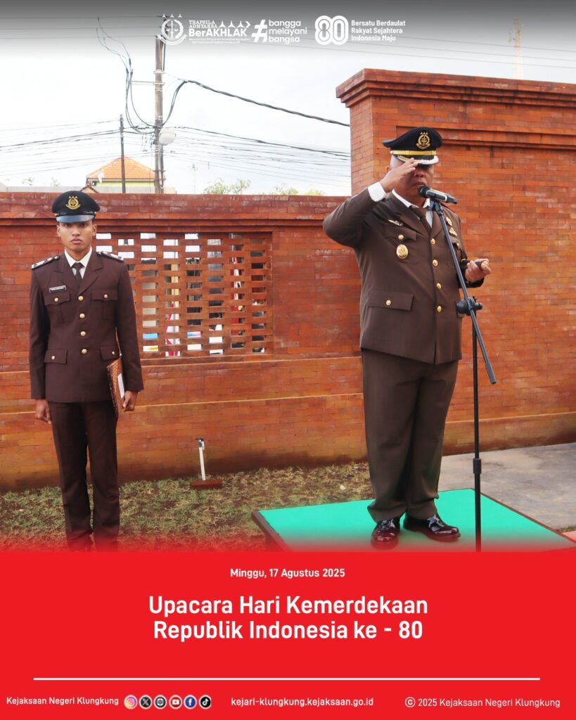 Kepala Kejaksaan Negeri Klungkung, I Wayan Suardi, S.H., M.H., bersama para Kepala Seksi, seluruh Pegawai Kejaksaan Negeri Klungkung, serta PPNPN Kejaksaan Negeri Klungkung melaksanakan Upacara Peringatan Hari Ulang Tahun ke-80 Kemerdekaan Republik Indonesia pada tanggal 17 Agustus 2025.