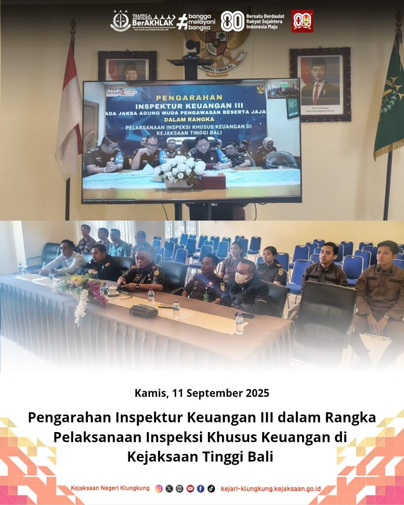 Kepala Kejaksaan Negeri Klungkung, I Wayan Suardi, S.H., M.H., didampingi para Kasi dan jajaran mengikuti Vicon Pengarahan Inspektur Keuangan III dalam rangka pelaksanaan Inspeksi Khusus Keuangan di Kejaksaan Tinggi Bali. 11/09/2025