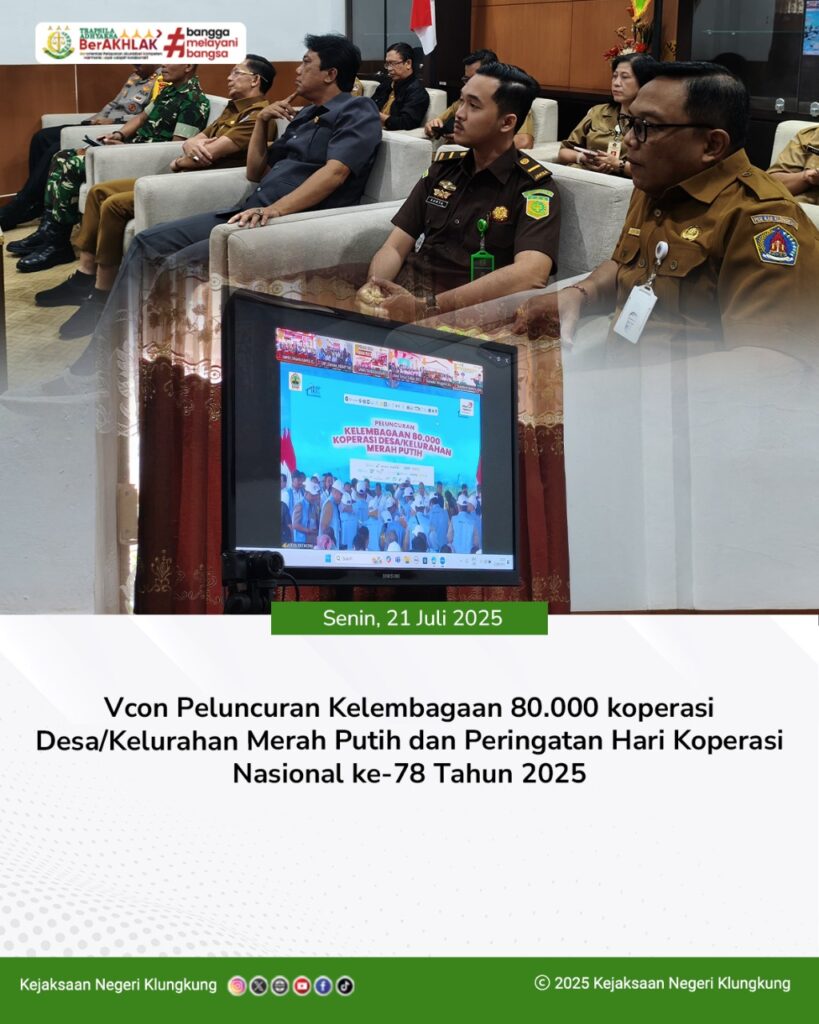 Senin tanggal 21 Juli 2025, sekira pukul 10.00 wita telah dilaksanakan Kegiatan Vcon Peluncuran Kelembagaan 80.000 koperasi Desa/Kelurahan Merah Putih dan Peringatan Hari Koperasi Nasional ke-78 Tahun 2025 yang bertempat di Kantor Bupati Klungkung.
