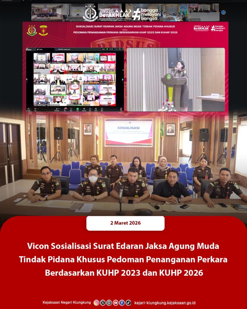 Para Kepala Seksi Kejaksaan Negeri Klungkung mengikuti kegiatan Vicon Sosialisasi Surat Edaran Jaksa Agung Muda Tindak Pidana Khusus tentang Pedoman Penanganan Perkara berdasarkan KUHP 2023 dan KUHAP 2025 yang diselenggarakan oleh Kejaksaan Tinggi Bali.