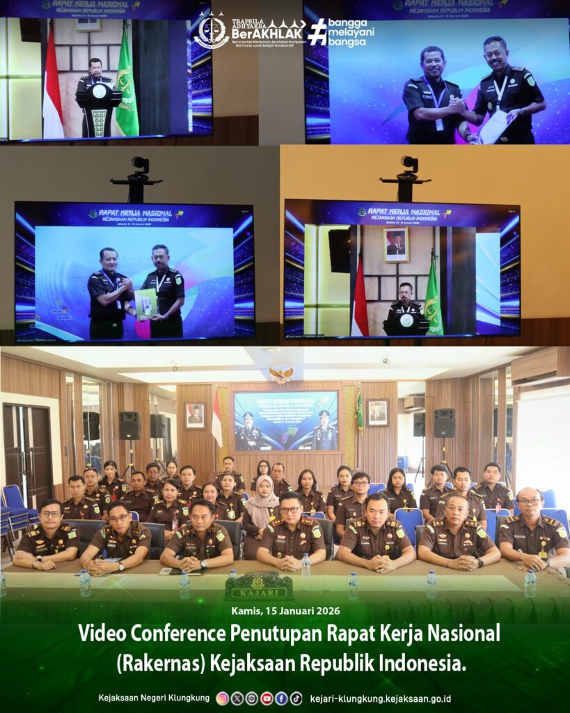 Kepala Kejaksaan Negeri Klungkung, R. Indra Senjaya, S.H., M.H., didampingi oleh Para Kepala Seksi serta seluruh Pegawai Kejaksaan Negeri Klungkung, mengikuti Video Conference Penutupan Rapat Kerja Nasional (Rakernas) Kejaksaan Republik Indonesia.
