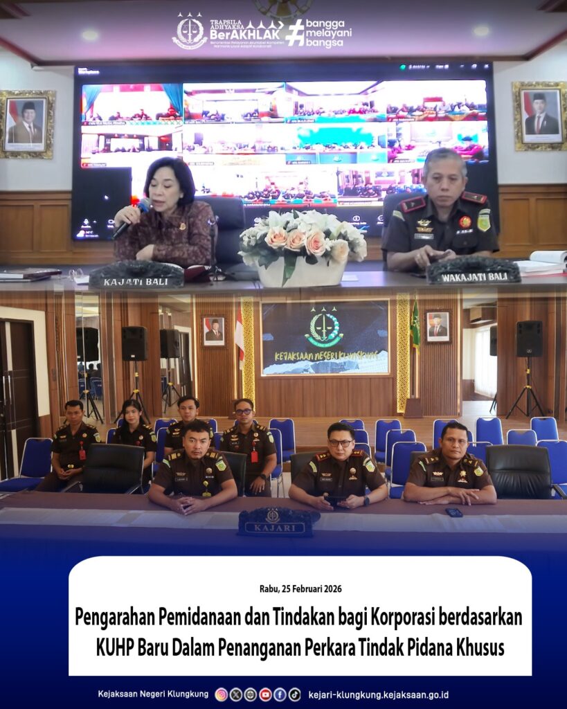 Kegiatan tersebut diikuti secara virtual oleh jajaran Kejaksaan Negeri se-wilayah Bali sebagai bentuk penguatan pemahaman dan penyamaan persepsi dalam penerapan ketentuan Kitab Undang-Undang Hukum Pidana (KUHP Baru), khususnya terkait pertanggungjawaban pidana korporasi dalam perkara tindak pidana khusus.