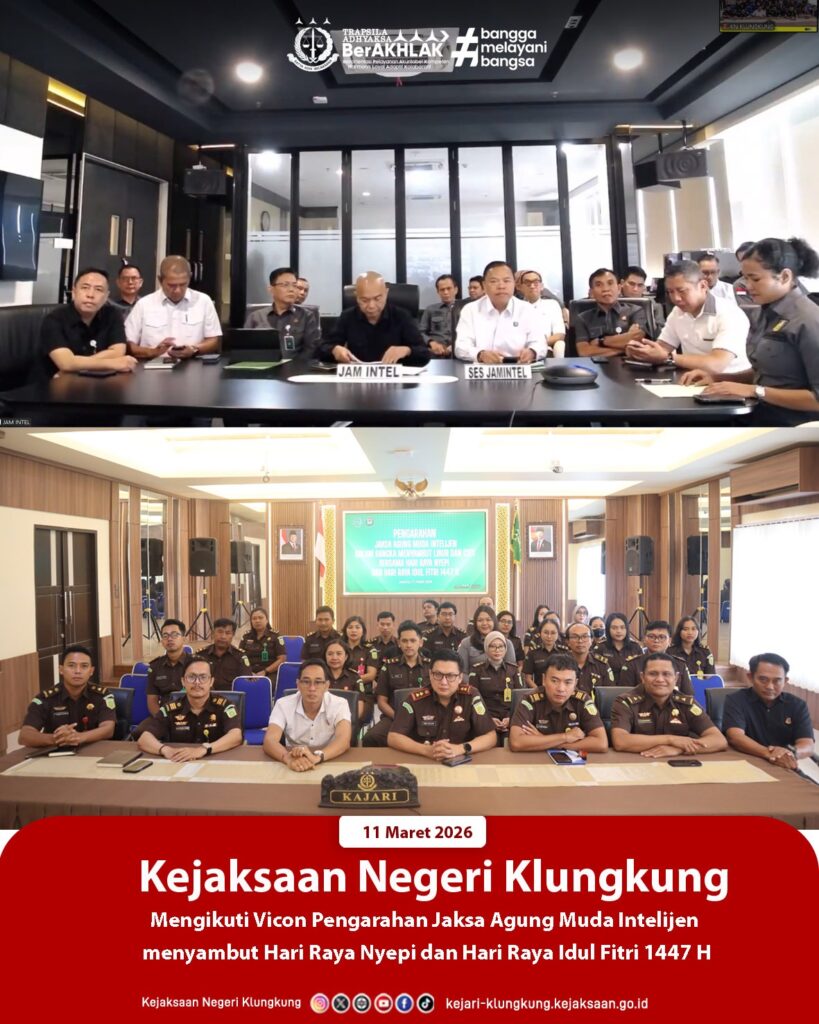 Kepala Kejaksaan Negeri Klungkung R. Indra Senjaya, S.H., M.H. beserta para Kepala Seksi dan jajaran Kejaksaan Negeri Klungkung mengikuti kegiatan Video Conference (Vicon) Pengarahan Jaksa Agung Muda Intelijen dalam rangka menyambut Hari Raya Nyepi dan Hari Raya Idul Fitri 1447 H, pada 11 Maret 2026.