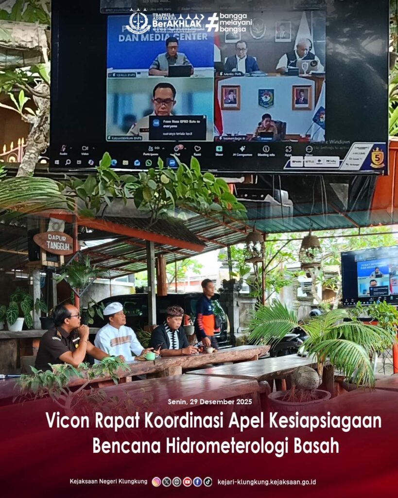 Kaur Perlengkapan, Daskrimti dan Perpustakaan Kejaksaan Negeri Klungkung, I Wayan Winartha, S.H., mewakili Kejaksaan Negeri Klungkung menghadiri Video Conference (Vicon) Rapat Koordinasi Apel Kesiapsiagaan Bencana Hidrometeorologi Basah yang diselenggarakan dalam rangka meningkatkan sinergi dan koordinasi antarinstansi dalam upaya kesiapsiagaan serta penanggulangan potensi bencana hidrometeorologi pada musim penghujan.